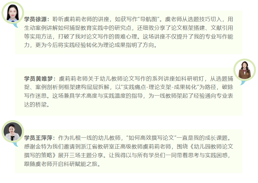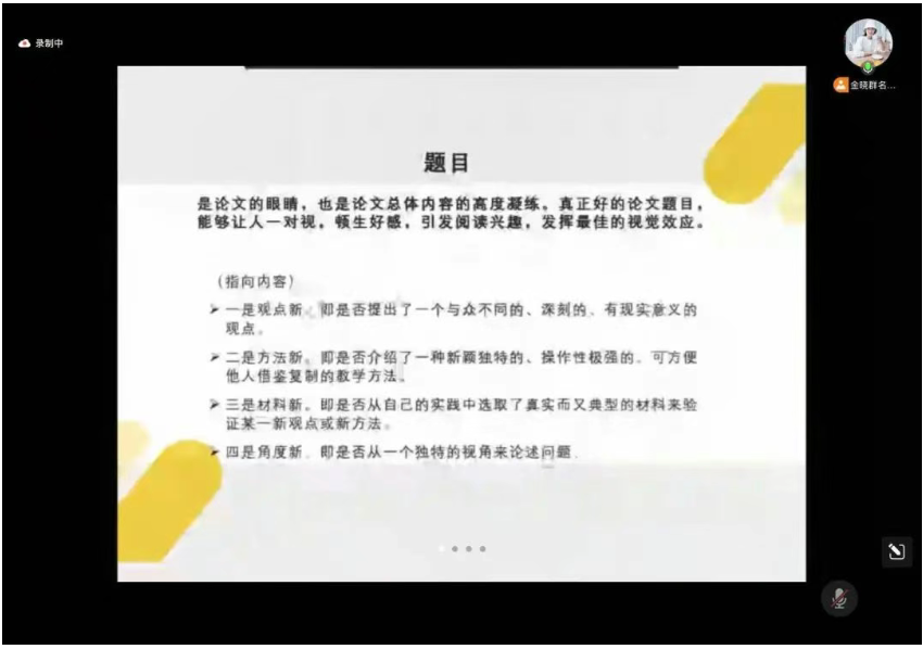 在科研的探索之路上,撰写论文是每一位扎根一线教师成长的必修课。为更好地助力工作室成员在学术领域取得长足进步,温州市金晓群名师工作站特意邀请了浙江省教育厅幼教教研员虞莉莉老师为大家做《幼儿教师论文撰写的策略》的线上专题研修。旨在通过名师的引领和经验的分享,激发教师们对论文撰写的热情,提升自身的论文写作技能。虞老师通过三个话题,以详实案例为引,深入剖析论文撰写核心要点,快跟着工作室的脚步,一起走进这场学术盛宴吧!