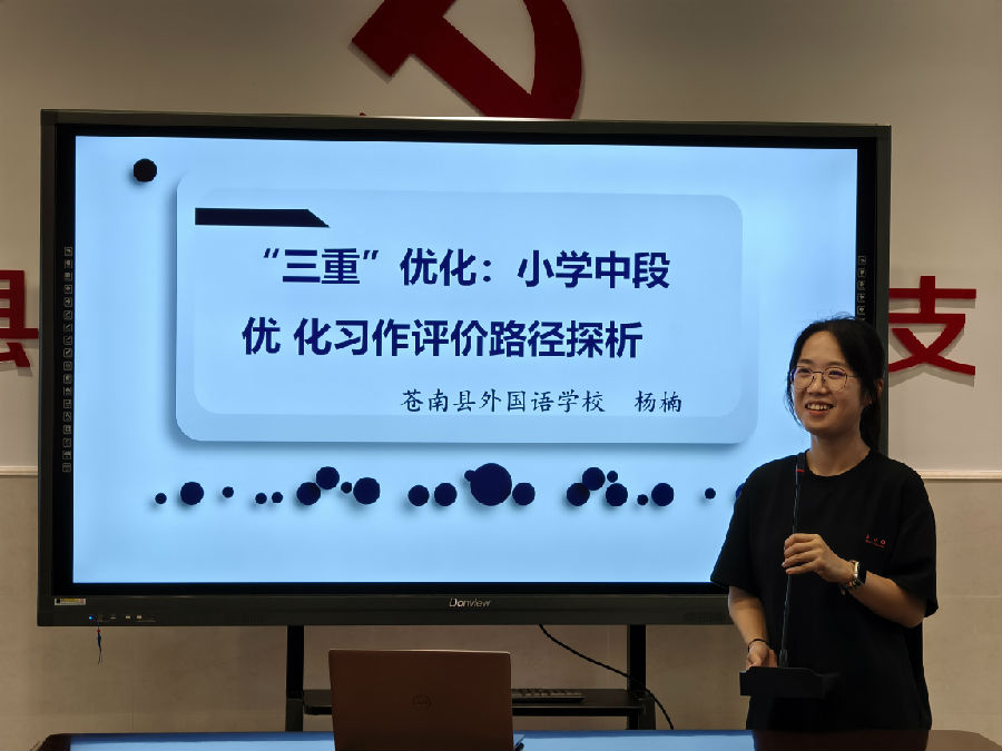 苍南县外国语学校的杨楠老师带来了《“三重”优化:小学中段优化习作评价路径探析》的课题汇报。她深入分析了当前小学中段习作评价存在的问题,并提出了“三重”优化的创新策略,通过实际教学案例展示了该策略在提升学生习作能力方面的显著成效。