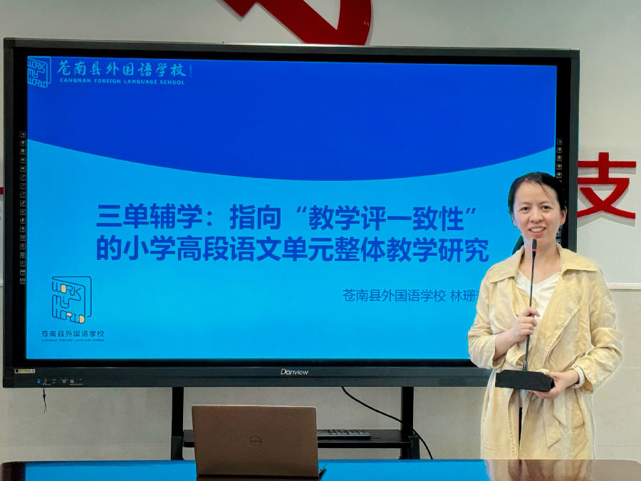 林珊珊老师同样来自苍南县外国语学校,她汇报的课题是《三单辅学:指向“教学评一致性”的小学高段语文单元整体教学研究》。林老师详细阐述了“三单”在教学过程中的具体应用,以及如何通过“三单”实现教学、学习和评价的一致性,为小学高段语文教学提供了新的思路和方法。
