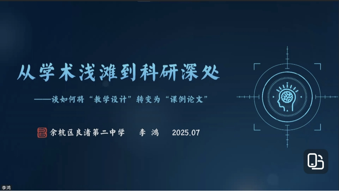 当理论基础与实践探索得以夯实后,余杭区良渚第二中学李鸿老师则将视角转向了教科研的转化与提升。在《从学术浅滩到科研深处》的分享中,李鸿老师系统指导了如何将日常的“教学设计”有效转化为高质量的“科研论文”。他从“选好题——搭框架——码字数——成文稿”四个关键步骤入手,精准指出了好论文的标准与方向,并详细解析了选题、文献综述、研究设计、写作到重构五个阶段的具体方法。最后,他以“光的反射”一课为例,直观演示了如何将教学设计转化为结构清晰、论证充分的课例论文,为教师们打通了教研结合的通道。