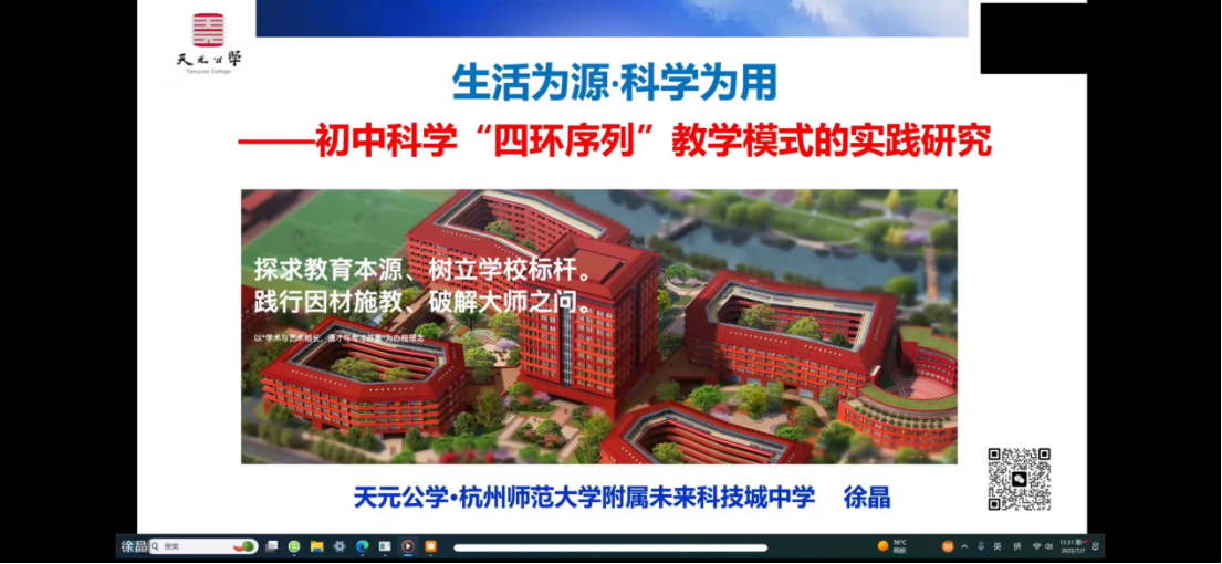 午后,研讨热度持续升温。杭州师范大学附属未来科技城中学的徐晶老师以《生活为源·科学为用——初中科学“四环序列”教学模式的实践研究》为主题,分享了她的教学理念与实践。徐老师秉持“生活即科学的起点,科学应服务于生活实践”的学科观,详细介绍了她致力于构建的“启·构·用·融”四环教学模式。通过多个鲜活的日常教学案例,她展示了如何努力打造让学生感受“有意思、有选择、有协作、有价值”良好体验的科学课堂,真正实现知行合一。