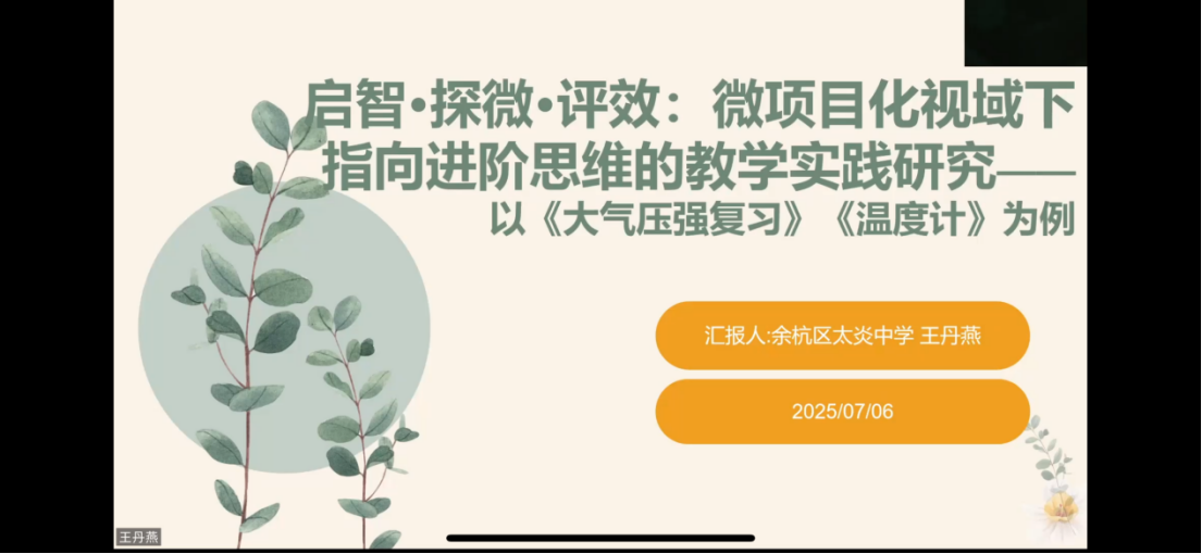 最后,余杭区太炎中学的王丹燕老师带来了《启智·探微·评效:微项目化视域下指向进阶思维的教学实践研究:以“大气压强”和“温度计”为例的教学实践》的经验分享。王老师以她亲身实践的两节课例,生动阐释了微项目化学习的模式。她强调其核心理念是以学生为中心,促进学生主动参与和自主探究,并具备聚焦问题灵活、实践性强、跨学科知识整合的特点。王老师通过将教学内容紧密联系生活实际,创设真实情境和项目任务,让学生在解决实际问题中运用知识、提升素养,为项目化学习的落地提供了可借鉴的范例。