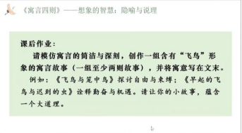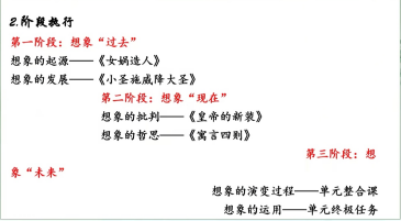 接着,陈涵、朱怡、潘钊妍、王方圆老师组成的教研小组分享了七上第六单元整体设计的思路说明。该小组从分析单元导语入手,指出本单元想象”这一人文主题,通过整合小说、童话、神话、寓言等文体,构建想象过去’‘现在’‘未来’”三阶教学体系。从《女娲造人》《小圣施威降大圣》的想象溯源与艺术逻辑,到《皇帝的新装》的想象批判,再到《寓言四则》的想象智慧,逐层推进。