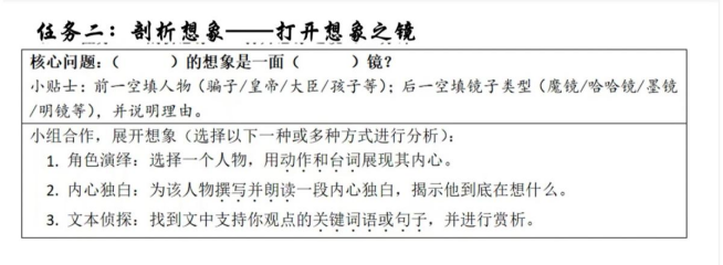 在整个单元的教学活动中,教师们聚焦单元整体思路,飞鸟”这一校园意象贯穿整个单元的情境任务,如绘制变化博弈图、创作飞鸟的试炼故事、撰写校园新装童话等,将想象训练与逻辑思维、现实关怀结合。同时,在单篇教学中突出方法指导,如《小圣施威降大圣》的变化斗法梳理与想象合理性探究,《皇帝的新装》的情节曲线绘制与虚构与真实辩证思考,让学生在读写实践中掌握想象的技法与深意。