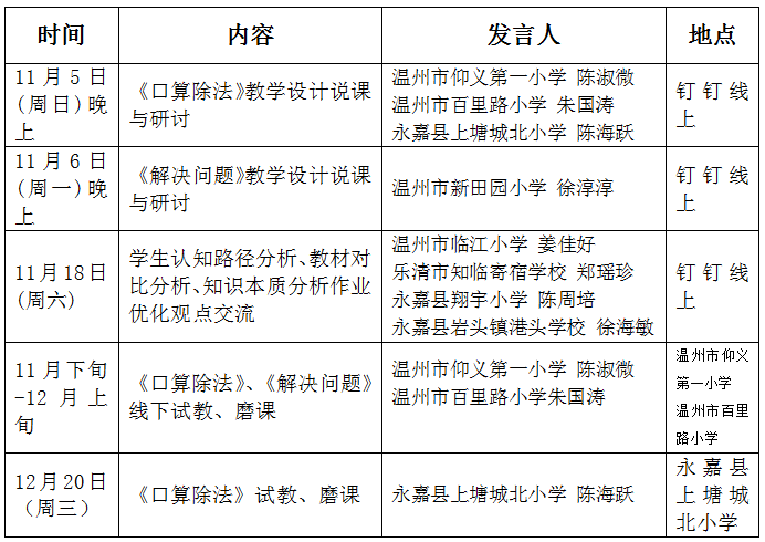 在 钉钉线上、温州市仰义第一小学、温州市百里路小学、永嘉县上塘城北小学举行活动,时间 1.5 天。