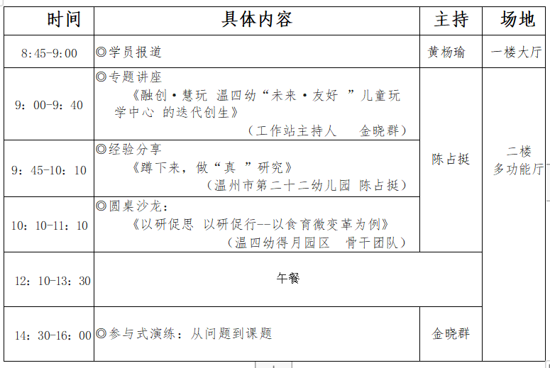 为充分发挥名师工作站及骨干教师示范引领作用,进一步提升教育科研能 力,促进骨干教师的专业发长,经研究,决定举行“ 以研促思 科研并进 ”—— 温州市金晓群名师工作站第二次研修活动。现将具体事项通知如下: