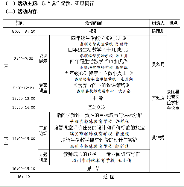 在 泰顺县特殊教育学校举行活动,时间 1 天。