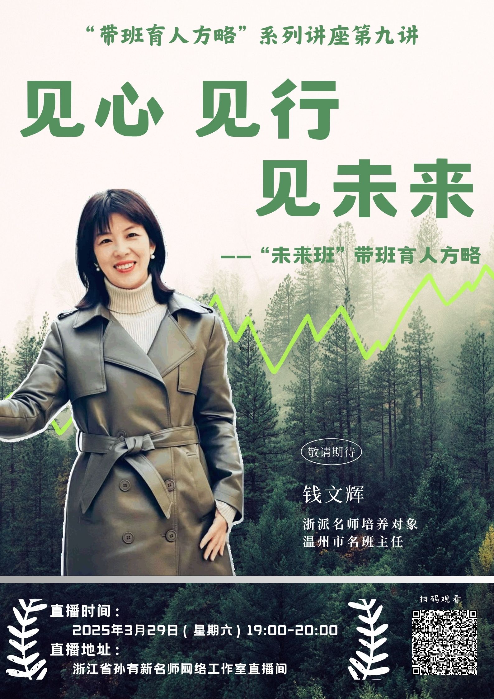 钱文辉,女,中共党员,高级教师,浙江省孙有新名师网络工作室学科带头人,现任教于瑞安市安阳实验中学。她是学生口中的“辉姐”,家长心中的“定心丸”,更是温州教育界的“多面手”!深耕教育一线25载,高级教师、浙派名师双重认证,从瑞安市首届模范班主任到温州市名班主任大满贯得主(优秀班主任/德育课教师/教坛中坚),荣誉等身却初心如磐,始终以党员先锋姿态扎根班级育人最前沿。 她不仅是课堂上的引路人,更是家庭教育的“桥梁搭建者”。身为瑞安市家庭教育金牌讲师,让3000+家庭找到亲子沟通密钥,每场家长会都被赞“走心又走新”;独创“情感浸润式”带班方略,带出N届市级先进班集体。学生评价她:“严厉时像尺,温柔时像诗”。温暖与智慧并存的教育行者,钱文辉老师与您相约直播间见证“带班育人方略”如何点燃万千学子心灯!